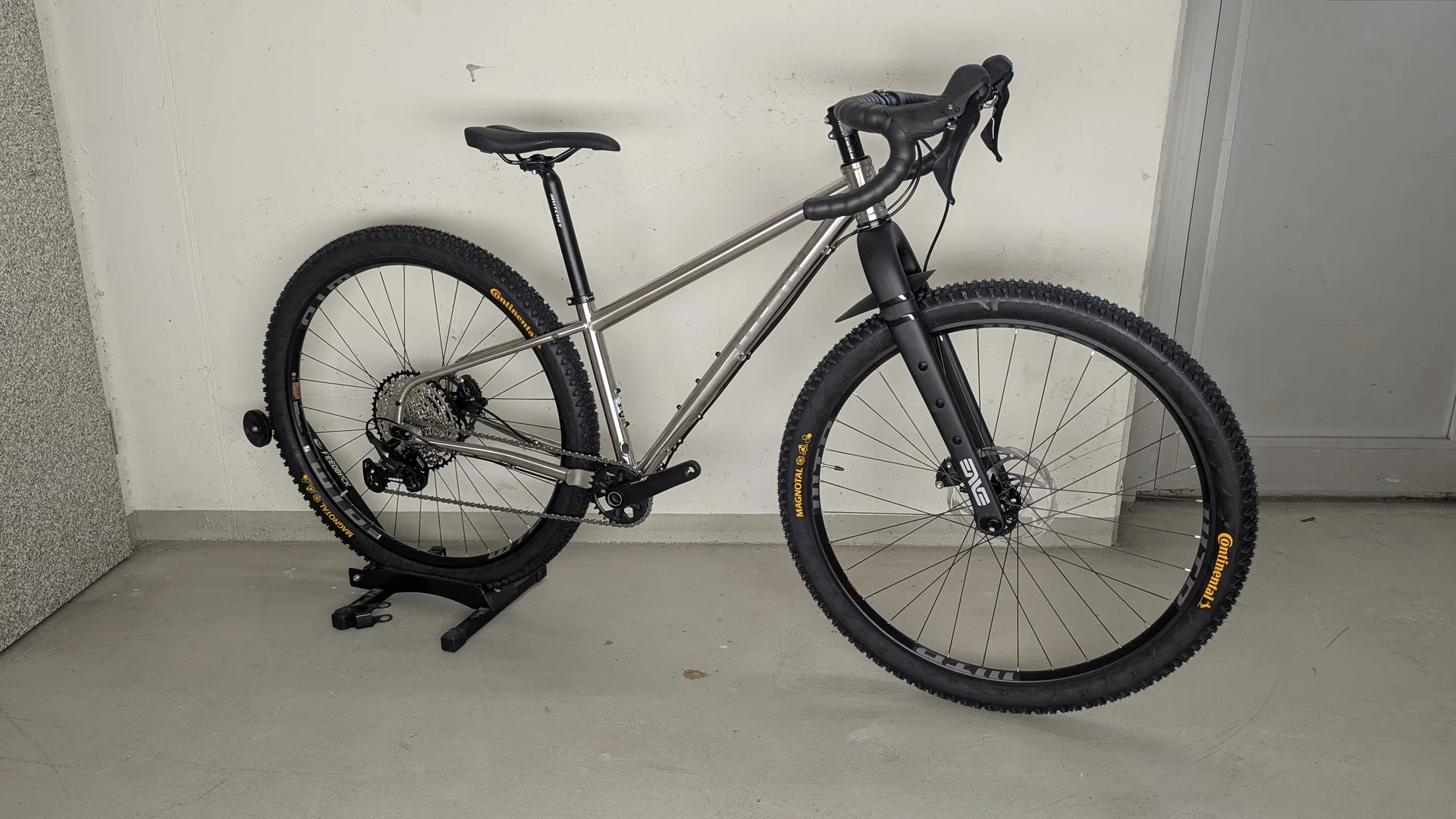Shimano GRX 1x12 10-51z mechanische Kettenschaltung - Shimano RX400 hydraulische Scheibenbremsen - WTB i30 Aluminium Laufräder - Ritchey WCS Carbon Lenker - ENVE Carbon Gabel - Continental Magnotal 29x2.4 Reifen