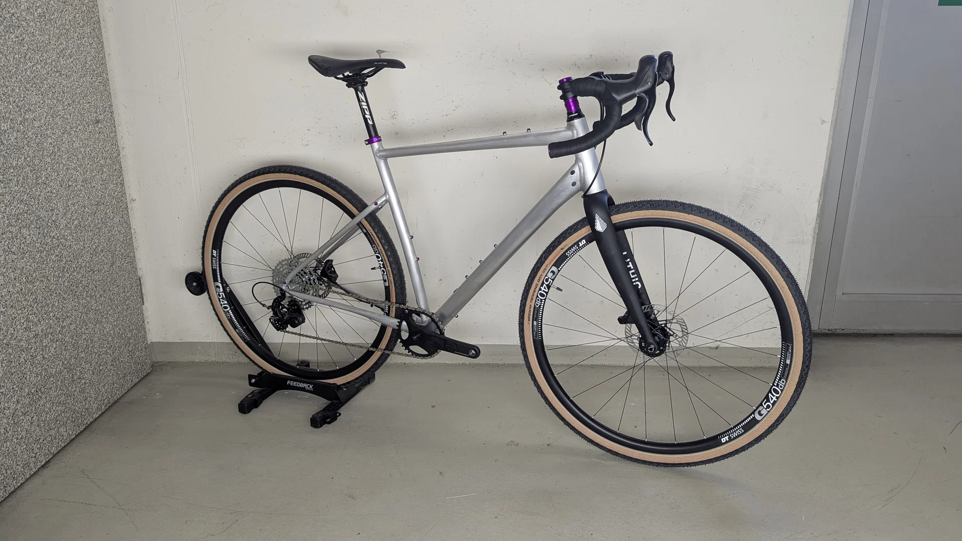 Customaufbau mit ablackiertem Rahmen - Campagnolo Ekar 1x13 9-42z Schaltung - Campagnolo Ekar 2-Kolben hydraulische Scheibenbremsen - Laufräder mit DT Swiss G540 Aluminium Felgen & SuperCycle Naben - Zipp Cockpit & Sattelstütze - Violette Anbauteile & Schrauben von Wolftooth