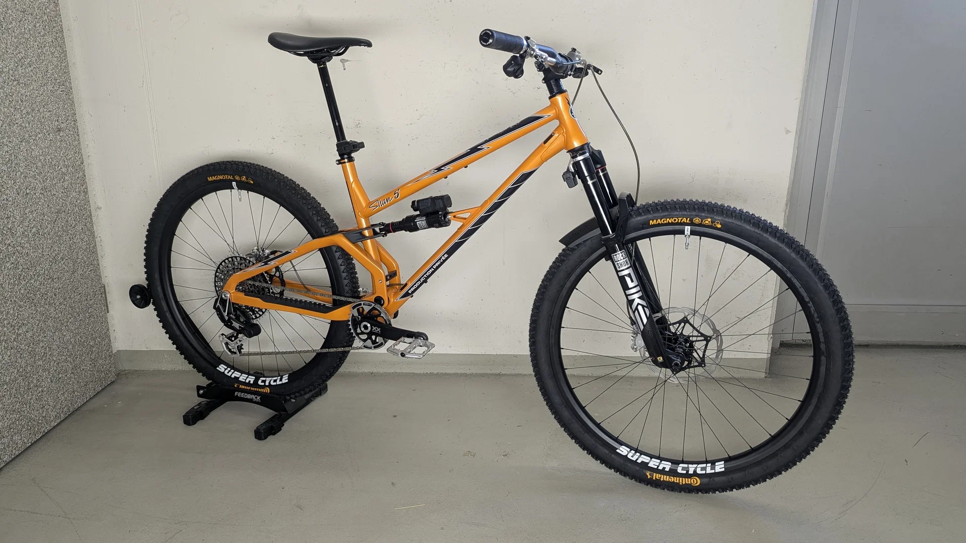 Weltweit einmalige Sonderlackierung in Lamborghini orange! - Sram XX Tranmission 1x12 10-52z Wireless Schaltung mit Quarq Powermeter - Formula Cura X 2-Kolben Bremsen - Rockshox Flight Attendant adaptives Fahrwerk - Rockshox Reverb AXS 200mm Sattelstütze - SuperCycle E35 Carbon Laufräder - Beast Components Carbon Sattel